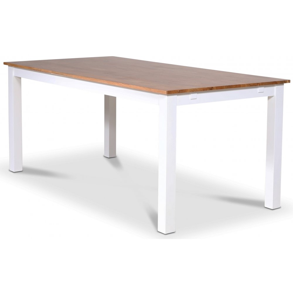 Dalsland matgrupp med stort och bra matbord med toppskiva i oljad ek och vitlackat underrede. 6 st Dalsland pinnstolar i en läcker gul lack (RAL1032)