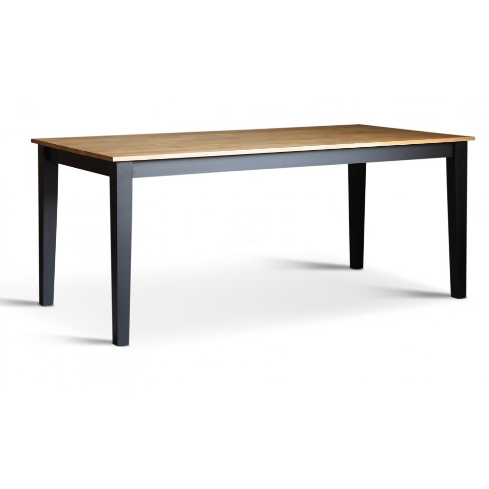 Dalsland matgrupp med stort och bra matbord med toppskiva i oljad ek och svartlackat underrede. 6 st klassiska Dalsland pinnstolar i grönlackat massivt trä.