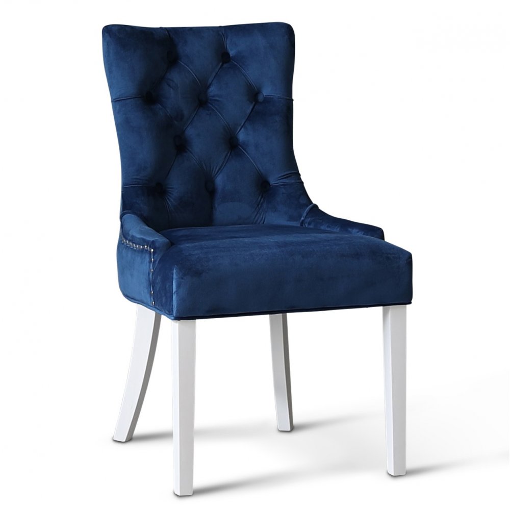 Dalsland matgrupp med runt matbord med toppskiva i oljad ek och vitlackat underrede. 4 st Tuva stolar i blå sammet.