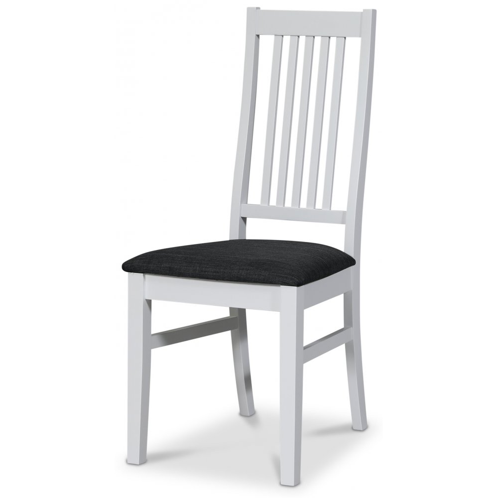 Klassiskt matgrupp, bord med underrede och toppskiva av massivt vitlackat trä. Modern stol i massivt heveaträ, vitlackad med sits av grått tyg.
