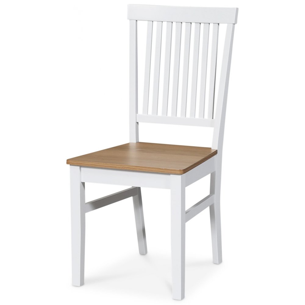 Klassiskt matgrupp, bord med underrede och toppskiva av massivt vitlackat trä. Modern stol i massivt heveaträ, sits i fanerad ek.