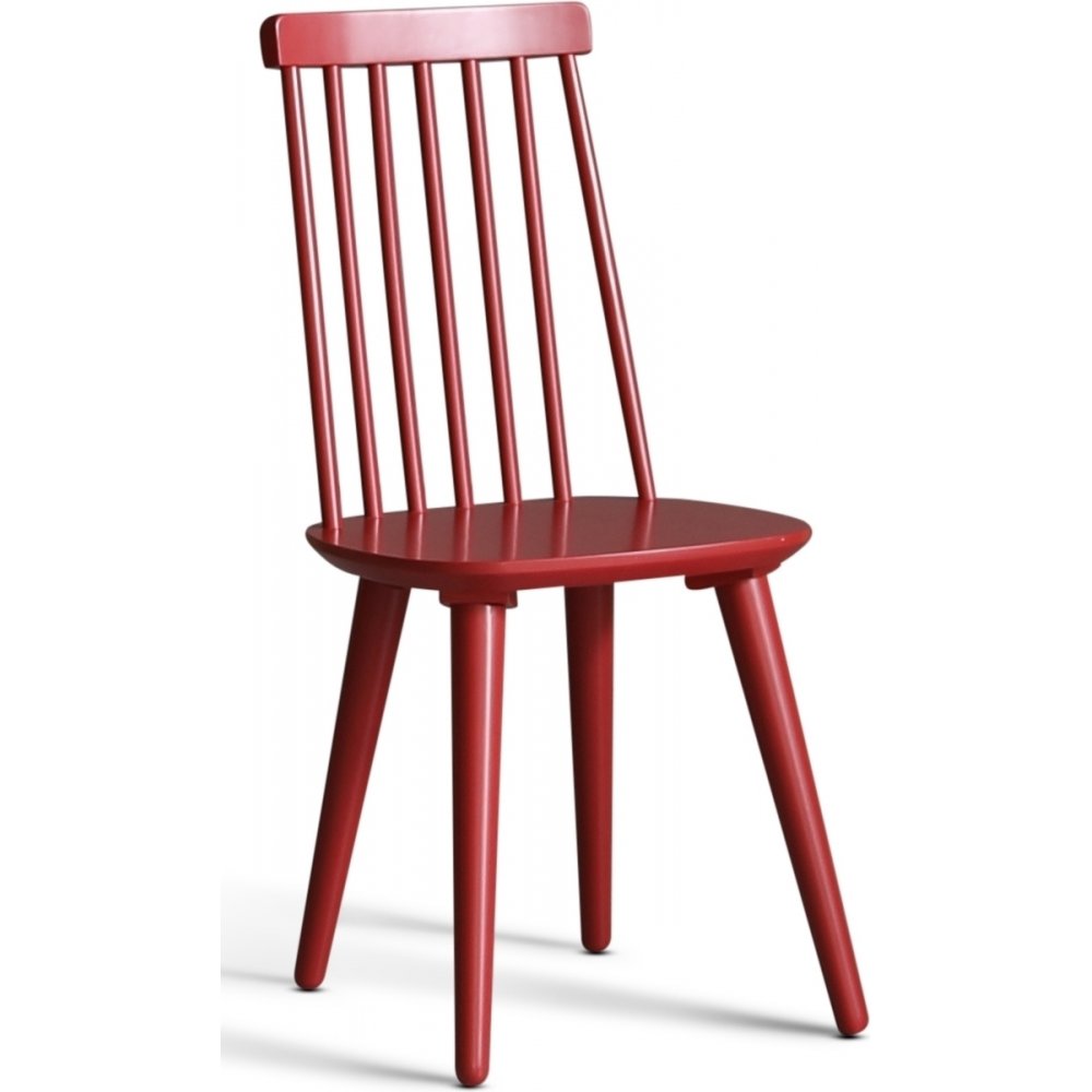 Dalsland matgrupp med runt matbord med toppskiva i oljad ek och vitlackat underrede. Dalsland pinnstolar i en läcker röd lack (RAL3003)