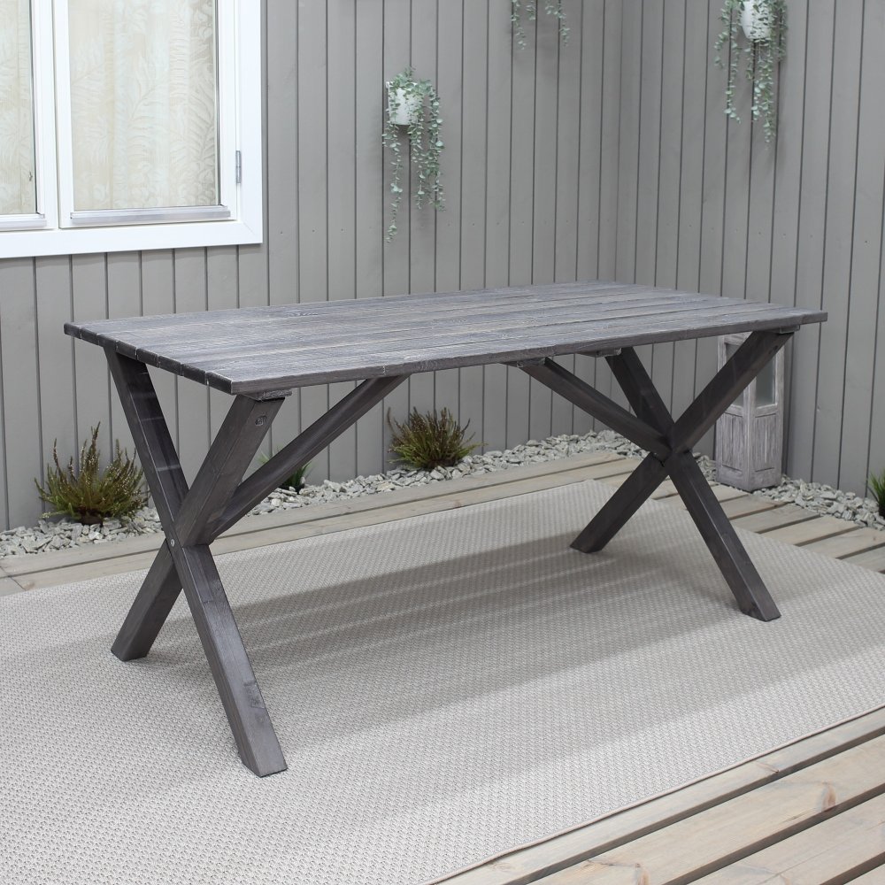Klassiskt bord i furu med en grålaserad yta från Skånska Möbelhuset. Kryssben som ger ett elegant och klassiskt utseende. Kombinera gärna med några utav våra utestolar för en komplett matgrupp till uteplatsen. Bordet har behandlats för att få den patina man förknippar med Shabby Chic. Eftersom detta arbete sker för hand får varje exemplar ett unikt utseende.
