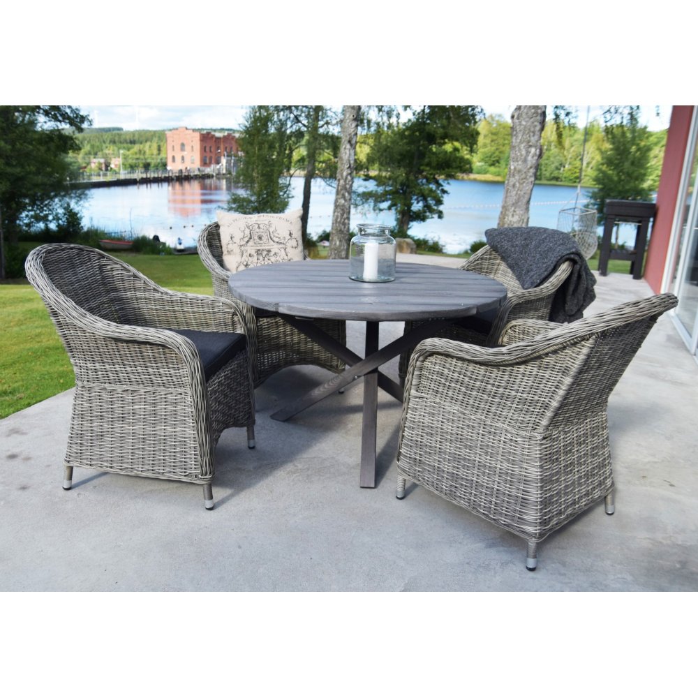 Scottsdale matgrupp för uteplatsen med ett runt rubust matbord, tillsammans med Skanör karmstol med skön komfort. Bordet är tillverkad i grålaserad furu vilket gör utegruppen väderbeständig och tålig för att klara uteplatsens miljö.